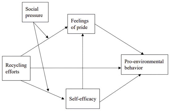 Self-efficacy theory is based on a triadic reciprocal determinism theory, which suggests a continuous interaction among personal, behavioral, and environmental factors [51]. Self-efficacy represents an individual’s knowledge about their abilities, leading to a positive appraisal of the future and, subsequently, a feeling of good mental pride [68]. Therefore, for an environmentally conscious person, participating in recycling activities could increase self-efficacy, leading to pride.