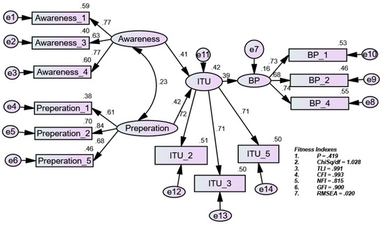| CMIN/df | 3–5 | Ullman (2001) [107], Less than 2 to 5 Schumacker & Lomax (2004) [113] | 1.028 |