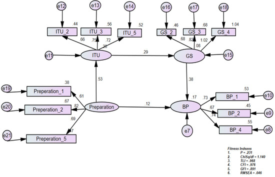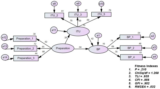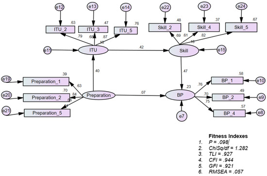 | Preparation -> Intention to Use (ITU) -> Skills -> Business Performance | 0.074 (0.629) | 0.132 | 0.013 | 0.509 | 0.021 | Full Mediation |