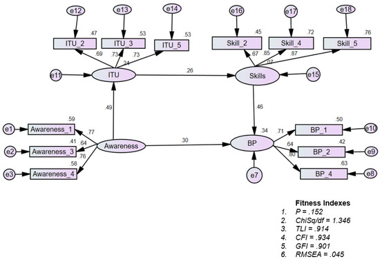 | Awareness -> Intention to Use (ITU) -> Skills -> Business Performance | 0.300 (0.055) | 0.052 | 0.002 | 0.164 | 0.043 | Full Mediation |