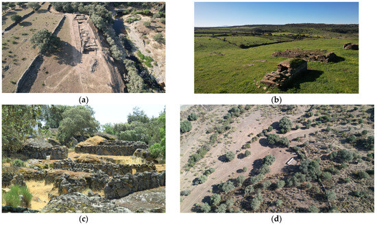 Material heritage of the dehesa: (a) Villasviejas de Tamuja site and mill. Dehesa boyal de Botija, (b) oven and hut. La Cumbre, (c) Corralás. Torrequemada, (d) trough. Zafra.