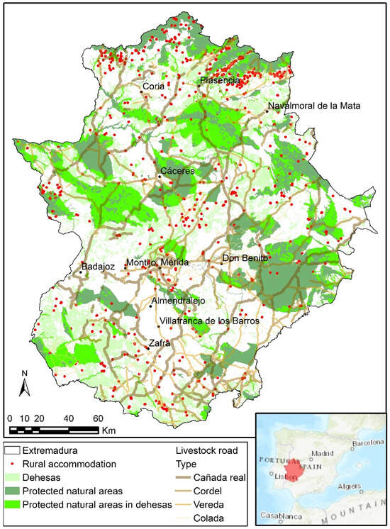 An example of this is that Extremadura has more than 30% of its surface area protected due to its extraordinary landscapes [70]. In addition, 35% of the region’s territory is covered by dehesa and, on many occasions, it overlaps with protected natural areas, providing added value [71] and, on numerous occasions, they overlap with those of protected natural areas, providing added value (Figure 2).
