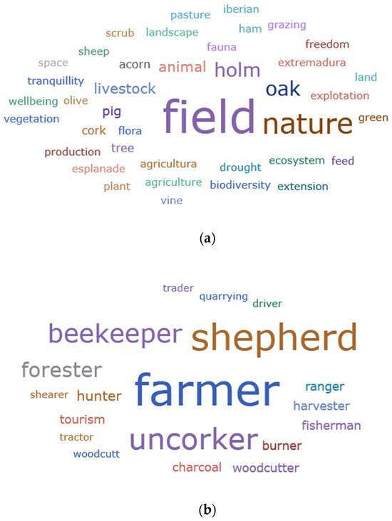 Along with the concreteness of the term, the imaginary was determined according to the main concepts that are linked to the dehesa (Figure 4a) and the traditional trades that take place there (Figure 4b). In fact, both terms appeared on 1218 and 1188 occasions.