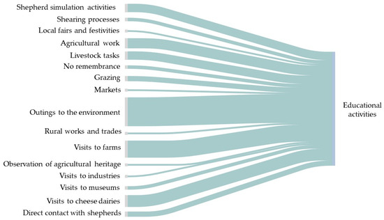 This main objective was directly linked to other specific objectives. Among them, the aim was to analyze the regularity with which students visit the dehesa areas and their degree of participation in educational activities related to pastoralism, both in the past and at present. These aspects have been considered since direct visits to the rural environment and participation in experimental and interpretative activities are essential for a better understanding and appreciation of the social environment, customs, ways of life and the cultural landscape [59,60,61,62,63].