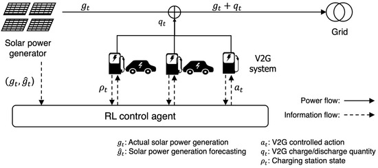 The objective of the V2G charging or discharging operation was to eliminate the SPG forecast error in Equation (2). Therefore, a positive action by expressed the charging operation, and vice versa.