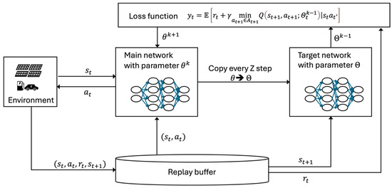 Finally, a target network with a delayed update approach is implemented. The loss function for the state–action value function approximation in Equation (23) is composed of the target value and the action value , with updates proceeding sequentially based on the gradient descent method. The target network with parameter is a clone of the main state–action value function approximation network with parameter . It is used to calculate the target values, as follows: