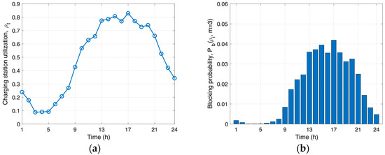 Charging station status. (a) Charging station utilization; (b) blocking probability of the charging station.