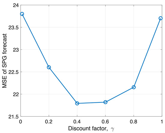 In Table 2, the MSE of the SPG forecast varies based on the discount factor in addition to the blocking probability threshold. To examine the impact of the discount factor on the MSE of the SPG forecasts more closely, Figure 4 aggregates the results across different blocking probabilities to depict the variation in MSE values that correspond to each discount factor. Figure 4 shows that the MSE of the SPG forecasts demonstrates the lowest value within the discount factor range of 0.4 to 0.6.