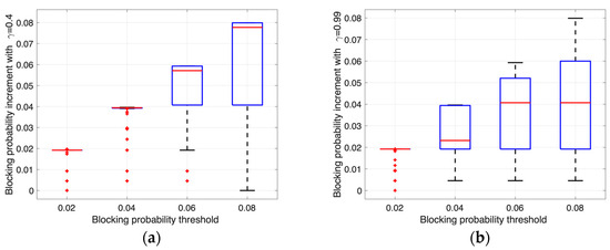 To examine the combined effects of the blocking probability threshold and discount factor on the V2G operations, Figure 5 presents the distribution of the maximum blocking probability increments in the form of boxplots. These plots delineate the 25% and 75% quantile values as the lower and upper bounds of the box, respectively, and the median (50% quantile) is represented by the central line. Figure 5a,b specifically illustrate scenarios with discount factors set at 0.4 and 0.99, respectively.