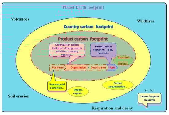 Boundary crossovers among the four types of carbon footprint are always encountered during carbon footprint assessment, as shown in Figure 1 [17].