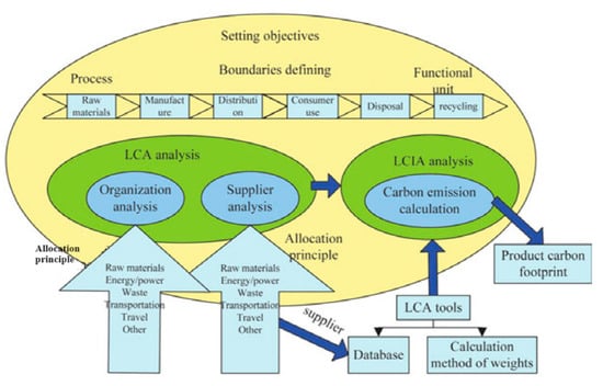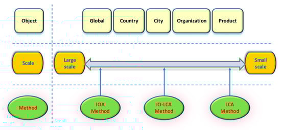 The assessment of carbon footprint varies based on diverse working units, different dimensions, and methods employed for calculating carbon emissions. The input–output analysis (IOA), life-cycle assessment (LCA) and IO–LCA are the three carbon-emission calculation methods that satisfactorily meet the requirement of the carbon footprint definition. In the case of small scale products, the bottom-up LCA method is used, while the top-down IOA is adopted at the global scale. On the other hand, the hybrid method of combining LCA and IOA is increasingly used in most research cases, as shown in Figure 2.