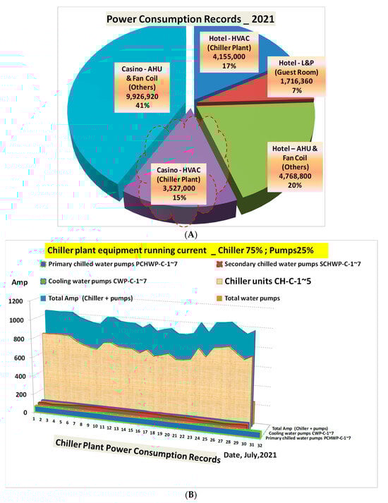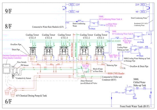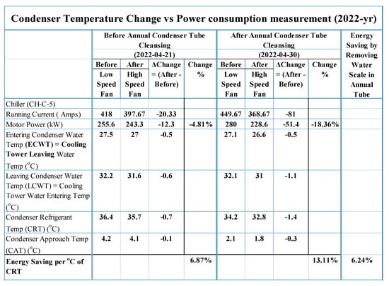 The energy savings were derived from the enhanced performance of the chillers. The effective descaling process improved the heat transfer efficiency of the heat exchangers, i.e., the cooling towers and condenser units. This, in turn, provided optimal operating temperatures for condensing refrigerant and improved the coefficient of performance (COP) of the chillers, resulting in an efficient operation. The outline of the system arrangement for reclaiming condensed water, water quality control, and the metering system are diagrammatically represented in Figure 5.