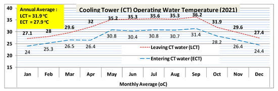 Throughout the monitoring period from January to December 2021, the temperatures of the water entering the cooling towers (ECT) and leaving the cooling towers (LCT) were recorded. It was observed that the highest LCT and ECT values were consistently recorded during the period from May to September 2021. On average, the LCT value was 31.9 °C, while the ECT value was 27.9 °C, as depicted in Figure 6.
