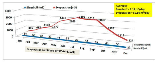 Over the course of the year, the average bleed-off volume was approximately 1.14 m3/day, while the evaporation rate was measured at 59.89 m3/day, as indicated in Figure 7.