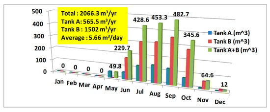 Because of limited space and existing congestion in the electrical and mechanical services, the condensed water pipe works were altered to collect the condensed water. This water was then stored in two separate tanks, Tank A and Tank B, located on different floors. These tanks not only stored the water but also acted as settlement tanks, removing any floating pipe rust and dust before the water flowed into the cooling tower water basin. During the hot and humid months, a significant amount of condensed water was reclaimed, as shown in Figure 8. In total, 2066.3 m3 of condensed water was reclaimed annually, averaging approximately 5.66 m3 per day.