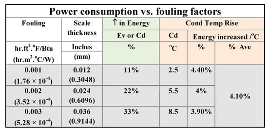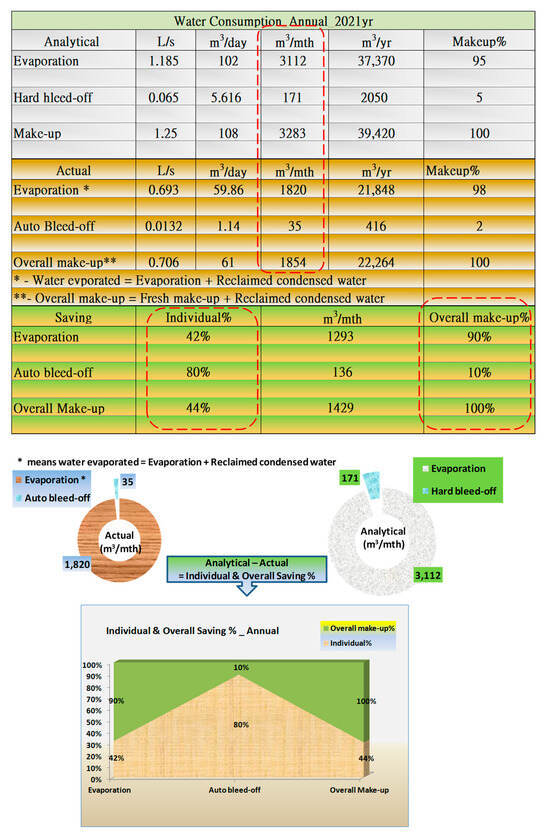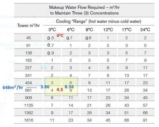 A cooling tower water flow rate of 648 m3/h, which was the cooling water pump flow rate circulating the system’s cooling water, and based on interpolation, a range temperature of 4℃ in the cooling tower required a new make-up water flow rate of 4.5 m3/h to compensate for the heat loads lost through evaporation. The bleed-off Equation (1) indicates that the higher the CoC, the less the bleed-off. This means that, at higher CoC settings, the water losses become equivalent to the water loss through evaporation, which must be replenished by the make-up water. In other words, the bleed-off decreases to its minimum value at higher CoC settings, resulting in an evaporation rate that is nearly equal to the make-up water rate [34]. Therefore, the manufacturer’ table for a CoC of 3 can be used to determine the make-up water demand for a CoC of 19.2. This calculation takes into account that 94.8% of the water loss is due to evaporation, while the remaining 5.2% is attributed to bleed-off, as explained in Section 2.3.
