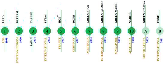 The introduction of rating tools began in the UK in 1990 with the development of the Building Research Establishment Environmental Assessment Method (BREEAM). LEED was first developed in 1998 by the United States Green Building Council (USGBC). Since then, many countries have developed different rating systems to measure the sustainability of buildings (Figure 1). In 2017 it was estimated that there were over 600 sustainable building rating systems in use across the globe [4].