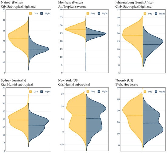 Probability of day and night dry bulb temperatures (°C) at selected cities, with Köppen–Geiger climate classification. Source: Betti et al. [66].