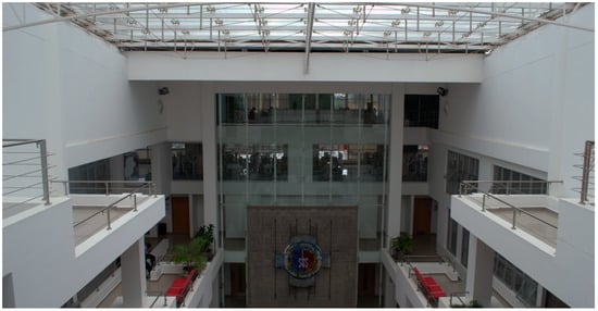 In a separate paper the authors examined the environmental design in case studies of ‘green’ buildings in Nairobi [74]. The Strathmore Business School was to be the first new-build LEED certified building in Kenya before certification was abandoned. Pursuing LEED certification added to the budget, primarily due to an inadequate understanding of the process, the cost of learning, procurement, and the import of technology, e.g., photovoltaic glass and louvres specified to attain points for renewable energy. A tender sum of KSh. 780 million was approved in 2008, equating to approximately KSh. 78,000/m2 or US $1100/m2, compared with an average construction cost for school buildings in Kenya of US $170/m2 [75]. One consequence of this was that the atrium, originally designed with a retractable roof, was simplified to feature fixed glazing only (Figure 3), which significantly affected the intended indoor environmental quality performance of the space. Prioritising LEED significantly increased the budget in order that renewable energy could be generated on-site (despite the Kenyan grid being largely powered by renewable energy), and an inappropriate modification to the central space of the building limited the ability of the building occupants to adapt their environment to the changing weather and seasons, impacting indoor environmental quality.