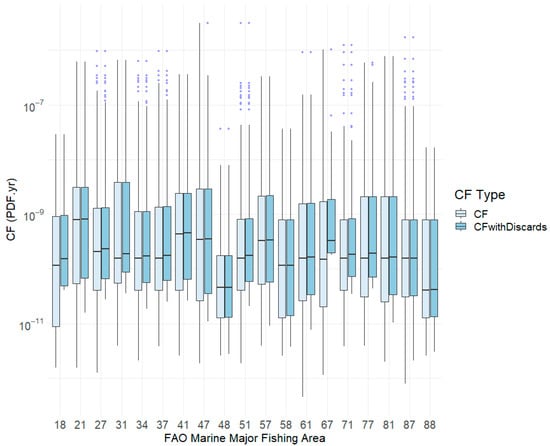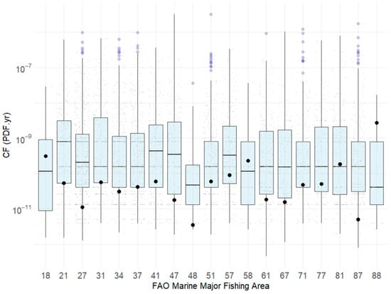 The median regional impacts consistently increase (Figure 4) but remain within the same order of magnitude (10−10). There is a marked effect on lower-impact CFs, with the lower regional distribution increasing; there are particularly prominent effects in many fishing regions, including 27, 34, 51 and 67.