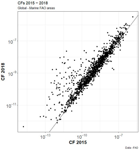 CFs generally do not contain temporal dynamism reflecting the variations in impact that occur as a result of any number of drivers (climate change, changing trends in anthropogenic pressure, regulatory measures). The recalculation of fisheries CFs from Helias et al. [] has provided an opportunity to investigate the magnitude of the impact of updating input data on CFs. A series of comparisons are made between the original (2015) and updated (2018) CFs, including global trends and average variation per fishing region, to better understand the significance of changing fisheries trends when integrated into the LCA framework. This insight into the temporality of CFs opens discussion about the most relevant timeframe of impact assessments, particularly in the context of exploited biotic resources, and as a result, the potential need to periodically revise these factors to maintain relevance with real-world impact trends.