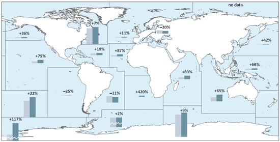 Almost all regions have experienced an increase in average impacts between 2015 and 2018, ranging between 2 and 420%, with only Areas 37, 41 and 87 experiencing reductions. Weighting the average by the reported catch allows the most relevant information to be taken into account. Despite catches remaining stable (−1.5%) in Area 47, a large average impact increase and 35% assessed biomass reduction suggest the potential degradation of stocks, although the unavailability of comprehensive stock assessments makes this difficult to validate [] and the impacts remain low relative to other areas. Similar trends are found in Area 51 where an increasing catch (16%) and reduced assessed biomass (−19%) drive rising impacts. Consistent increases in relatively high impacts are noted across the Southern Ocean (88, 58), although limited data for this area lowers the confidence of these results.