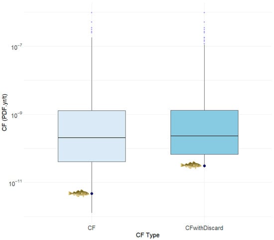 Regionalised stock CFs (no discards) are distributed over eight orders of magnitude (OM) between 4.53 × 10−13 PDF.yr/t (9.36 × 10−8 species.yr/t) and 3.16 × 10−6 PDF.yr/t (6.52 × 10−1 species.yr/t), compared to 10 OM in Helias et al. [], with a similar interquartile range (2 OM). The median value is 1.55 × 10−10 PDF.yr/t (3.10 × 10−5 species.yr/t).