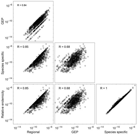 Relationship between regional and global-scale CFs (Class 1 stocks) from 2018 input data, converted using three regional to global scaling factor methods (GEP, relative endemicity and species-specific). R values in log scale.
