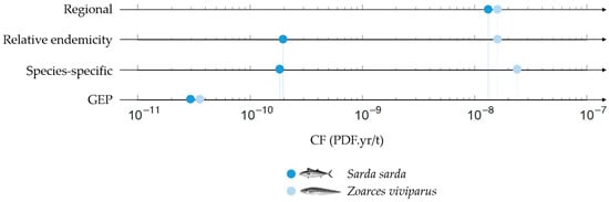 From an ecological perspective, endemic species should have a higher global CF, as the depletion of a species occurring in only one area represents a higher likelihood of extinction than the local depletion of a cosmopolitan species, due to the inability to be repopulated by an external population []. This is demonstrated by the visible variation in the impact magnitude between the endemic (Zorarces viviparus) and cosmopolitan (Sarda sarda) species with the application of the alternative scaling factors, an effect that is hidden by the aggregation of vulnerability to a single value in the GEP approach. Differences both in the magnitude of impact and between species demonstrates the importance of differentiating between species at the global scale, which is of direct interest in the context of fisheries management.