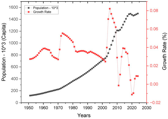 In several nations, due to rapid urbanization in recent years, some development projects and unplanned and inefficient energy studies use strategies have led to increasingly severe alterations in the land surface temperature (LST) in urban areas. Several studies have indicated that the Gulf Cooperation Council (GCC) countries, namely the United Arab Emirates, Bahrain, Kuwait, Oman, Qatar, and Saudi Arabia, are expected to undergo significant urban expansion in the near future [11]. The urbanization rate in each of these countries has exceeded 80% over the past decade [12]. The expansion of metropolitan areas typically leads to a rapid growth of impervious surfaces, which, in turn, amplifies the rise in LST [13]. Although much focus has been given to the urban dynamics of major metropolitan areas in the area, middle-sized urban agglomerations and cities have not been thoroughly examined. Bahrain is a very typical example for such these urban agglomerations, which is located on an island in the central region of the Gulf area. As the main entry point to the region and an agglomeration with a population of one million, it has experienced rapid urbanization. Although there have been a few studies on urbanization in Bahrain, the correlation between LST and urbanization has not been investigated. Several researchers have studied the association between LST and land use and land cover in relation to climate change, urban planning, soil ecology, and vegetation health. Therefore, this study aimed to study the correlation between LST and the process of urbanization in the typical Gulf urban area of Bahrain. The current population of Bahrain in 2024 is 1,498,712, a 0.89% increase from 2023. The population of Bahrain in 2023 was 1,485,509, a 0.9% increase from 2022. The population of Bahrain in 2022 was 1,472,233, a 0.61% increase from 2021. The population of Bahrain in 2021 was 1,463,265, a 0.96% decline from 2020 [14]. Figure 1 elucidates the annual population growth from the beginning of the 1950s until 2024.