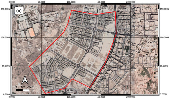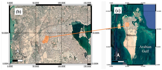 The Al Ramila suburb is one of several projects being created in Bahrain to meet the demand for housing. The Al Ramli suburb area covers 107.216 hectares. Figure 2a illustrates the exact bounds of the Al Ramila suburb, while Figure 2b,c depict the precise micro and macro locations, respectively. The suburb is extended from 50°30′26.47″ E to 50°31′15.00″ E and from 26°10′03.26″ N to 26°10′46.29″ N.