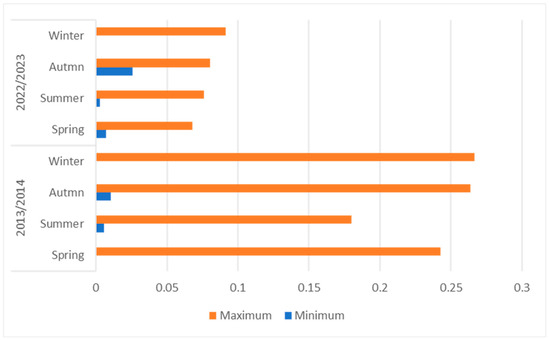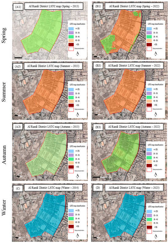 The land surface temperature (LST) was derived using data from Band 10 of the Landsat 8 OLI/TIRS satellite for both the pre- and post-development periods of the study area. Figure 8 displays the categorized land surface temperature maps of the study area for the four seasons in the years 2013–2014 and 2022–2023. The LST maps identified a rise in springtime LST, with the temperature in 2013 being categorized as high. The maximum and minimum temperatures recorded were 42.8 °C and 38.2 °C, respectively. In 2022, most of the study area was categorized as having a very high LST, with some areas experiencing high LSTs. The highest recorded LST was 47.1 °C, while the lowest was 43.8 °C. In fall 2013, the temperature ranged from a maximum of 42.2 °C to a minimum of 38.1 °C, with a high LST classification. However, in 2022, the LST was significantly higher, with a maximum of 50.7 °C and a minimum of 46 °C. The LST classification remained unchanged during both the summer and winter seasons. The summer season was categorized as having an extremely high LST, whereas the winter season was categorized as having a moderate LST. The seasonal variation of the land surface temperature (LST) pre- and post-development of the study area is shown in Figure 9.