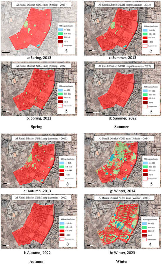Spatial pattern of the NDBI over the study area at (a) Spring 2013, (b) Spring 2022, (c) Summer 2013, (d) Summer 2022, (e) Autmn 2013, (f) Autmn 2022, (g) Winter 2014, and (h) Winter 2023.