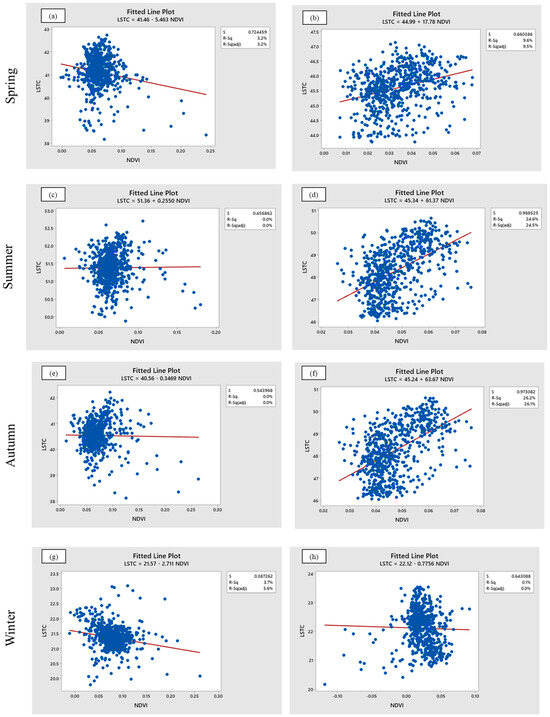 Regression models for the NDVI and LST at (a) Spring 2013, (b) Spring 2022, (c) Summer 2013, (d) Summer 2022, (e) Autmn 2013, (f) Autmn 2022, (g) Winter 2014, and (h) Winter 2023.