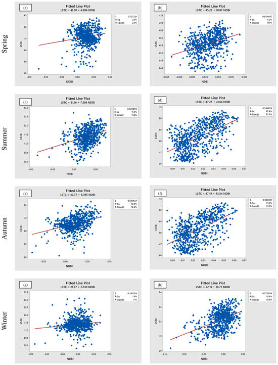 Regression models for the NDBI and LST at (a) Spring 2013, (b) Spring 2022, (c) Summer 2013, (d) Summer 2022, (e) Autmn 2013, (f) Autmn 2022, (g) Winter 2014, and (h) Winter 2023.
