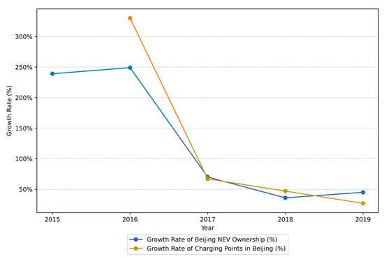 Beijing has also implemented its own policies regarding charging points. In April 2016, it released the “Special Plan for Electric Vehicle Charging Infrastructure in Beijing (2016–2020)” with the goal of reducing the charging service radius to 0.9 km in key areas by 2020, thus establishing a model area for charging point construction. This plan, coupled with the national subsidy, led to a significant increase in the number of charging points in Beijing. By the end of 2015, Beijing had 5132 publicly accessible charging points and 12,084 private charging points. Just one year later, these numbers had risen to 12,000 and 46,000, respectively. The growth rates of Beijing’s NEV ownership and charging points are shown in