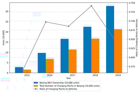 16]. Recognizing the importance of charging point availability in ensuring a stable energy supply for NEVs, the Chinese government has actively promoted their widespread construction. In January 2016, the Chinese government released a notice that outlined the “13th Five-Year Plan” for the subsidy policy on new energy vehicle charging points. The policy aimed to facilitate the construction and operation of charging points, as well as the upgrading, renovation, and establishment of monitoring systems for charging and battery swapping services (specifically for Beijing, the threshold for receiving subsidies for the promotion of new energy vehicles in 2016 was set at 30,000 units, with a subsidy amount of RMB90 million. For every additional 2500 units sold, an extra RMB7.5 million would be added to the subsidy pool, capped at a maximum of RMB120 million).