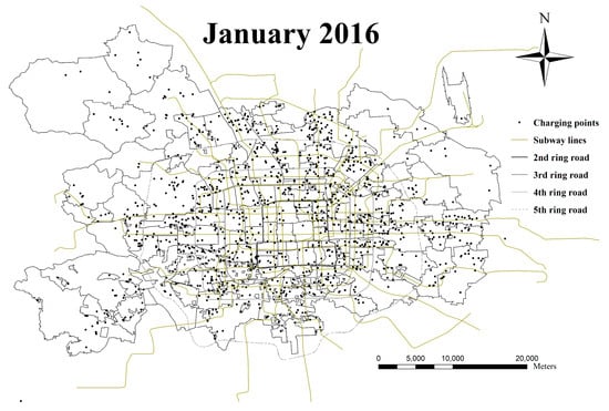 In addition, to examine the robustness of our findings, we collected data for the location of charging points from the Beijing Municipal Commission of Housing and Urban–Rural Development. The data contained information on residential complexes in Beijing that were equipped with self-use charging points for EVs in January 2016 and July 2016. This timeframe marks the initial phase of Beijing’s concerted efforts to promote the construction of charging points, which is pertinent to our study. According to the Commission’s records, 2108 residential complexes had integrated self-use charging points in January 2016. This number grew remarkably to 5404 complexes by the end of July 2016. Utilizing these data, we are able to determine which properties had charging points within the complex. Specifically, we generated two dummies for January and July, respectively, which labeled a complex as a “CP-complex” if the nearest charging point was situated within 300 m.