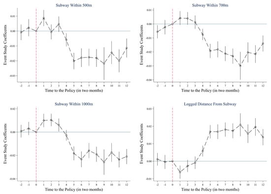 In Equation (3), serves as an indicator for the two-month period relative to the policy’s implementation. We used the period as the baseline, which represents the two months immediately preceding the policy (November–December 2015). The coefficient captured the incremental effects of subway proximity on housing prices for each two-month period . We did not expect significant values for when ; this served as the test of the parallel pre-trend assumption. In addition, the coefficients for positive were captured here, which revealed how the impact of the charging point subsidy policy evolved over time.
