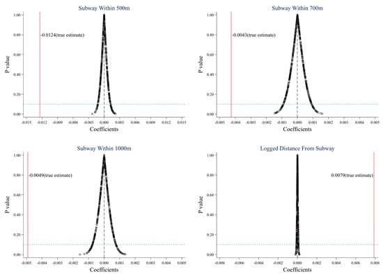 Table 3. The first three columns report the coefficients of the binary variables for subway proximity, which took 1 when the property of the transaction was within 500, 700, or 1000 m from the closest subway station. The coefficients of the interaction term between these measures and policy implementation are all significantly negative. Moreover, the continuous measure of subway proximity showed similar results, with a negative premium gradient and a positive interaction term. We found that the positive impact on property values attributed to subway proximity had diminished, ranging from a decrease of 0.43% to 1.24% of overall housing prices after the implementation of the NEV charging point subsidy policy. Dividing the negative effect by the total subway premium, we found that the policy reduced the overall subway premium by 65.96% for properties within 500 m, 21.62% within 700 m, 48.14% within 1000 m, and 77.25% as indicated by the continuous distance variable. This implies the considerable effect that the charging point subsidy policy has had on the demand for public transportation.