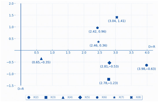 - Horizontal vector D + R indicates the overall significance of each factor within the system. This vector reflects both the impact of a particular factor on the entire system and the influence of other system elements on this factor. Consequently, in terms of importance, domain X(2) occupies the highest priority, followed sequentially by domains X(8), X(5), X(3), X(7), X(6) and X(4).