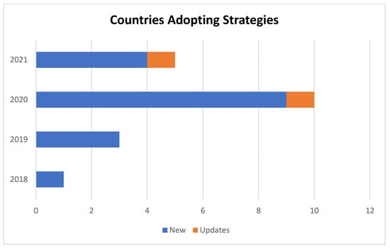 The rapid increase in global awareness has led countries to gradually introduce national strategies and policies that specifically address the hydrogen economy [36,37]. Most countries are making progress in addressing global climate change. Japan, for example, is the frontrunner, as the country launched its strategy in December 2017 and updated it in 2019 [9]. South Korea is following in the footsteps of the pioneer by developing and adopting a national strategy in 2018 before other countries begin to develop their national strategies [38]. The momentum for adopting such strategies has been increasing since 2020. The most recent countries that have just published their strategies include the Czech Republic, Colombia, Hungary, Norway, and the United Kingdom [20]. Figure 2 shows the annual progress of all countries in developing national hydrogen strategies as of 2021.