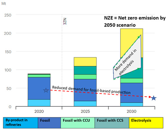 The development of hydrogen technologies is increasing rapidly nowadays [15]. According to a study [49], demand is expected to increase by four to five percent annually. As shown in Figure 4, there is a higher demand for hydrogen produced by electrolysis. Although electrolysis costs are relatively high, they can be reduced significantly over time once the technology and infrastructure for deployment are stable and widely spread [28,50]. The intangible costs of this process include the generation of harmless water, the slowing of ice melt and rise in sea levels, and human health protection over the long term [51]. These benefits have a significant impact on climate change recovery.