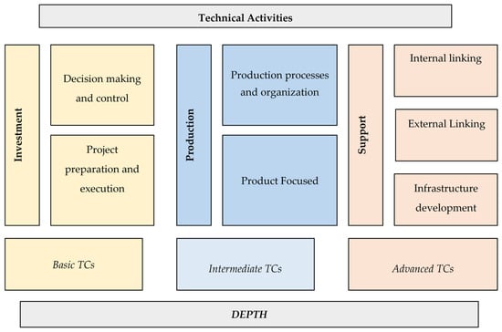 The characterization of technological capabilities (TCs) varies depending on the type of organization developing them and the sector to which it belongs. For instance, a study on the evolution of TCs in the Indian automotive industry and the necessary public policies for updating these capabilities categorized TCs into three levels: basic (operational capabilities), intermediate (reproduction and adaptation capabilities), and advanced (innovation capabilities). The findings were pivotal in formulating public policies to enhance these capabilities in India’s automotive sector [87]. Similarly, research by Roshartini et al. on TCs measurement in technology transfer projects evaluated and compared these capabilities in six different construction sector companies [136]. For example, the evaluation of the technology usage capability revealed different development levels: use of incorporated technology (basic level), use of new imported equipment (intermediate level), and technology obtained through the company’s R&D (advanced level). The results facilitated the creation of a framework for assessing TCs in technology transfer projects within the Malaysian construction sector.