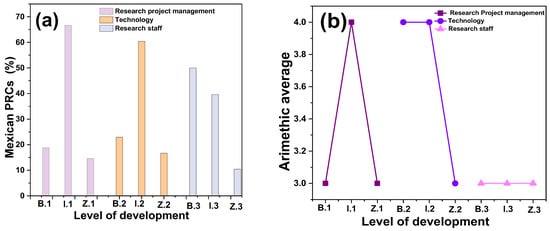 Figure 2 shows the level of investment capabilities in the PRC, indicating that 66.67% develop the intermediate level of project management (I.1). This means they manage their own technological research projects, which are pre-approved by their higher institutions, adhering to institutional resource management protocols. The literature suggests that research centers, especially in developing countries, operate under institutional oversight protocols that limit resource management [79,140].