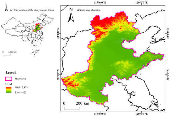 The Huang-Huai-Hai Plain, located in the eastern region of China (Figure 1), spans across the lower sections of the Yellow River, Huai River, and Hai River watersheds. It stretches from the Yan Mountains in the northern part, with geographical coordinates extending from 110° to 123° E and 31° to 43° N, down to the Dabie Mountains in the south, bordered by the Taihang Mountains to the west, and fronts the Yellow Sea and the Bohai Sea to the east. The total area of this expansive region is roughly 544,200 square kilometers. With a significant north-south stretch, the region is characterized by a temperate monsoon climate, with average annual temperatures ranging from 8 to 14 °C and average annual precipitation levels between 434 and 862 mm. Predominantly flat with fertile lands and suitable for agriculture, the central part of the region, except for the higher terrain in the northwest, is a vast plain. It serves as a vital base for the production of commercial grains, cotton, oil, meat, and fruits in China. The region enjoys clear seasonal changes, with a warm and moist climate, ample sunlight, and plentiful heat resources, which are conducive to the growth of a variety of crops, especially cereals such as wheat and corn, which are leading in national production. By 2020, in terms of various land use types, arable land accounted for about 57%, construction land about 17%, forests about 17%, grasslands 7%, and water bodies and unused land approximately 2%.