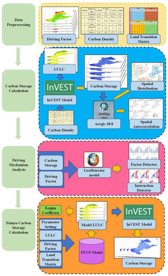 Based on ArcGIS (version 10.8), this study couples the InVEST-GeoDetector-PLUS model to analyze the spatiotemporal changes in carbon storage within the research area, discusses the driving forces behind these changes, and conducts multi-scenario simulations for the year 2030 carbon storage (Figure 2).
