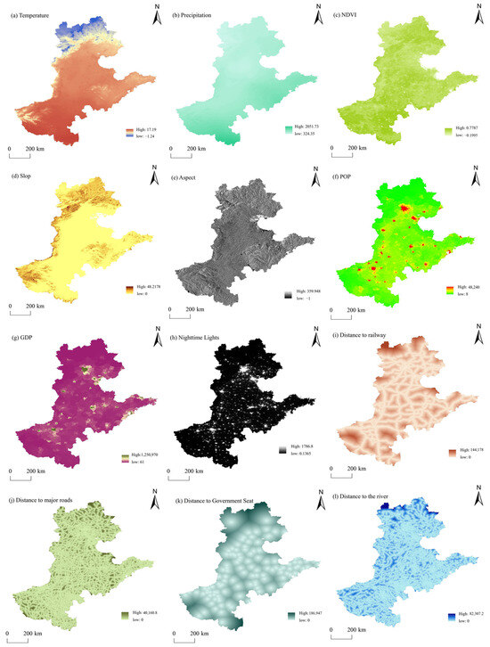We used ArcGIS 10.8 for preprocessing of driving factors; the projection coordinates are uniformly converted to “WGS_1984_UTM_Zone_51N”. The Euclidean distance tool is used to process the accessibility factors, and the driving factors are extracted using the mask extraction tool with a pixel size set to 300 × 300 m, resulting in uniformly parameterized raster data (Figure 3).