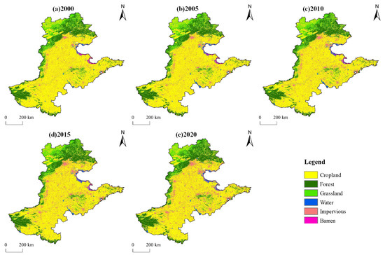 Spatially (Figure 5), the composition of land use types is relatively stable, with cropland mainly concentrated in the extensive central plains. Forests are primarily located in the north, west, and southwest, while grasslands are predominantly in the northwest. Impervious is found in the central plains and coastal regions, water bodies are sporadically distributed, and barren land is scattered along the coast, making up a very small proportion of the total area.