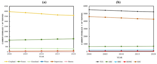 (a) Carbon storage of different land use types (2000–2020). (b) Carbon storage of different types of carbon pools (2000–2020).